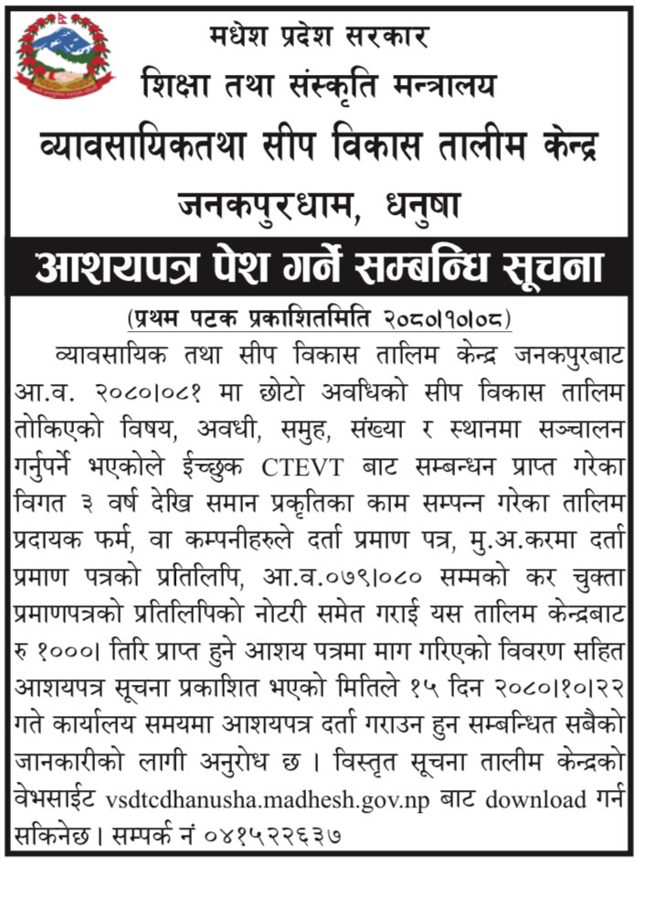 ०८०।१०।८ गते प्रकािशित अाशय पत्र पेश गर्ने सबन्धि सूचना